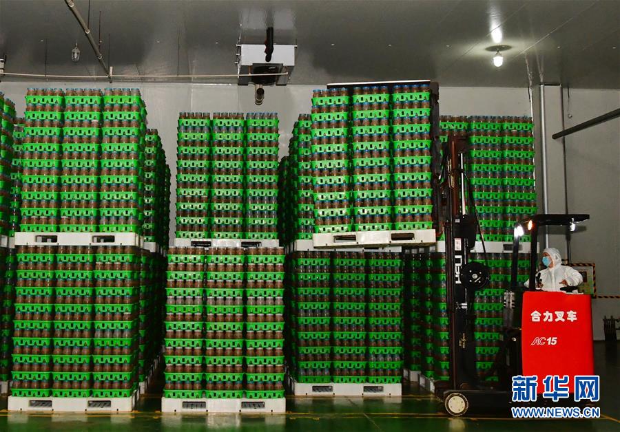 在位于清豐縣的河南龍豐實業(yè)股份有限公司,一名工人操作叉車在培養(yǎng)車間搬運(yùn)接種后的食用菌栽培瓶(9月28日攝)。新華社記者馮大鵬攝