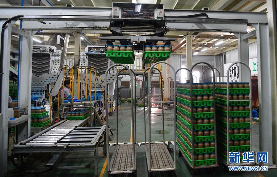 在位于清豐縣的河南龍豐實業(yè)股份有限公司,“機械手”在裝瓶車間自動轉運食用菌栽培瓶(9月28日攝)。新華社記者馮大鵬攝