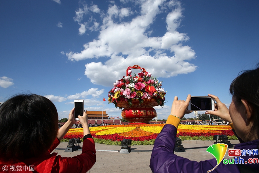 2018年9月29日,北京迎來高顏值好天氣,天安門廣場(chǎng)“祝福祖國”花壇在藍(lán)天白云映襯下壯美如畫。游客紛紛拿起手機(jī)、相機(jī)拍照留影充滿節(jié)日氣氛。