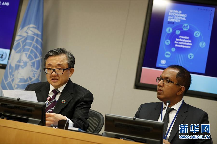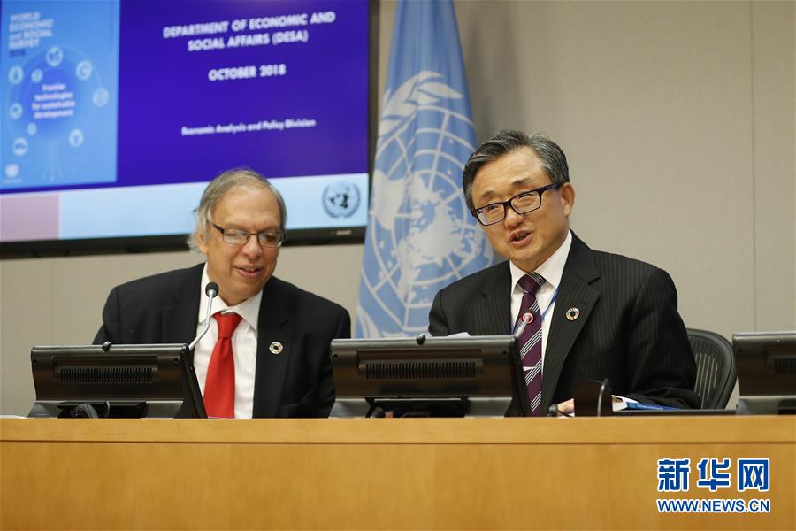 10月8日,在位于紐約的聯(lián)合國總部,聯(lián)合國負責經(jīng)濟和社會事務(wù)的副秘書長劉振民向記者介紹《2018年世界經(jīng)濟和社會概覽》。新華社記者李木子攝