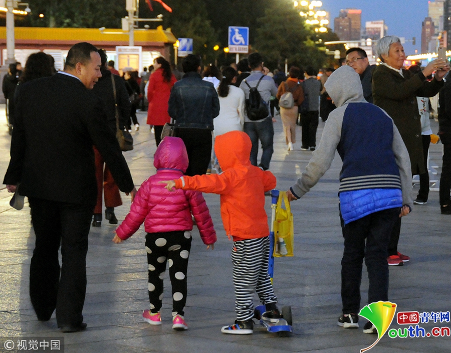 中國(guó)青年網(wǎng)北京10月10日電 2018年10月9日,北京,游客紛紛著秋冬裝游覽天安門廣場(chǎng)。當(dāng)天北京冷空氣來(lái)襲。圖片來(lái)源:視覺(jué)中國(guó)