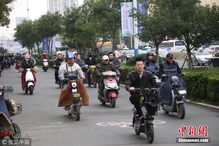 2018年10月9日,山東濟南,昨日一場秋雨過后開始降溫,今天清晨最低氣溫只有6度,馬路上不少上班族穿上羽絨服騎車趕上班路。 圖片來源:視覺中國