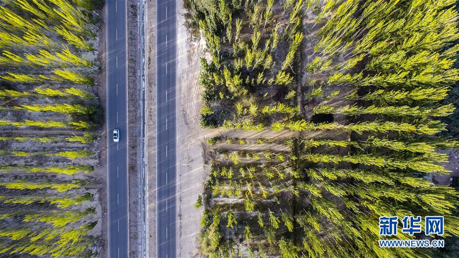 車輛行駛在新疆阿克蘇地區(qū)柯柯牙綠化工程核心區(qū)(9月20日無人機(jī)拍攝)。 在世界第二大流動性沙漠——塔克拉瑪干沙漠西北邊,一條逾百萬畝的人工林帶傲然挺立。 這條林帶就是柯柯牙荒漠綠化工程。它是新疆阿克蘇黃沙漫漫和碧波萬頃的分界嶺。 1986年,為改變惡劣的自然條件,阿克蘇啟動柯柯牙綠化工程。30年間,各族干部群眾攜手奮斗,曾是沙塵暴策源地的柯柯牙綠樹成蔭;并以此為原點(diǎn),在南疆戈壁荒灘上孕育出百萬畝的“綠?!?。 30多年來,阿克蘇打造出“人走政不息”的樣本,使綠色發(fā)展理念成為幾代人的廣泛共識;“自力更生、艱苦奮斗、無私奉獻(xiàn)”的柯柯牙精神,已融入各族兒女血液中;“以林養(yǎng)林”“邊綠化邊脫貧”的綠化、脫貧方式,給其他荒漠地區(qū)貢獻(xiàn)了“柯柯牙智慧”。 新華社記者 胡虎虎 攝