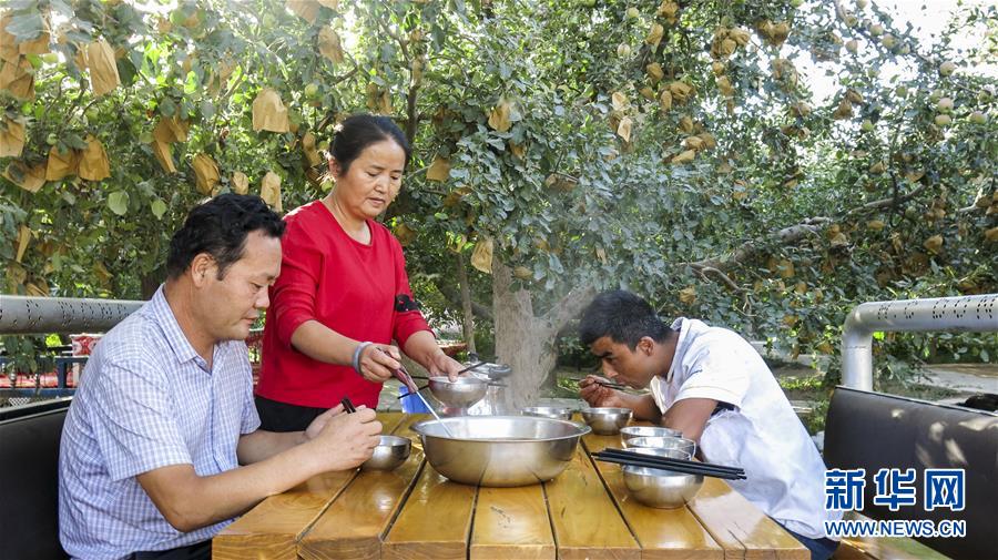 甘永軍(左一)在地處新疆阿克蘇地區(qū)柯柯牙綠化工程內(nèi)的果園吃飯(2017年9月22日攝)。10年前,甘永軍還在果園開(kāi)起了第一個(gè)農(nóng)家樂(lè),帶動(dòng)周邊100多戶果農(nóng)經(jīng)營(yíng)起了自家庭院。 在世界第二大流動(dòng)性沙漠——塔克拉瑪干沙漠西北邊,一條逾百萬(wàn)畝的人工林帶傲然挺立。 這條林帶就是柯柯牙荒漠綠化工程。它是新疆阿克蘇黃沙漫漫和碧波萬(wàn)頃的分界嶺。 1986年,為改變惡劣的自然條件,阿克蘇啟動(dòng)柯柯牙綠化工程。30年間,各族干部群眾攜手奮斗,曾是沙塵暴策源地的柯柯牙綠樹(shù)成蔭;并以此為原點(diǎn),在南疆戈壁荒灘上孕育出百萬(wàn)畝的“綠?!?。 30多年來(lái),阿克蘇打造出“人走政不息”的樣本,使綠色發(fā)展理念成為幾代人的廣泛共識(shí);“自力更生、艱苦奮斗、無(wú)私奉獻(xiàn)”的柯柯牙精神,已融入各族兒女血液中;“以林養(yǎng)林”“邊綠化邊脫貧”的綠化、脫貧方式,給其他荒漠地區(qū)貢獻(xiàn)了“柯柯牙智慧”。 新華社記者 杜剛 攝