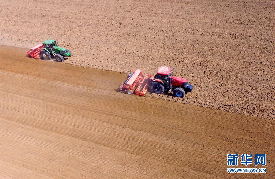 10月14日,河北省南和縣閆里鄉(xiāng)閆里村農(nóng)民在田地播種冬小麥(無人機拍攝)。新華社記者 朱旭東 攝