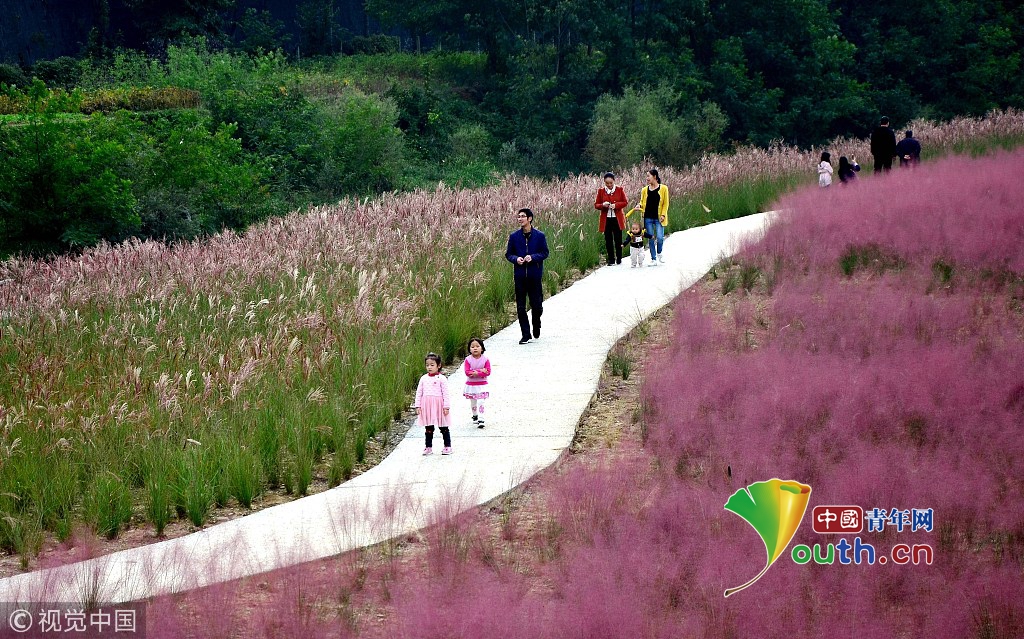 中國青年網(wǎng)北京10月7日電 2018年10月6日,游客在“粉色田野”里游玩、留影。粉黛亂子草是一種觀賞草種,該植物夏季為主要生長季,全株綠色,花期為9月中旬至11月中旬,開花時,綠葉為底,粉紫色花穗如發(fā)絲從基部長出,遠(yuǎn)看如紅色云霧。