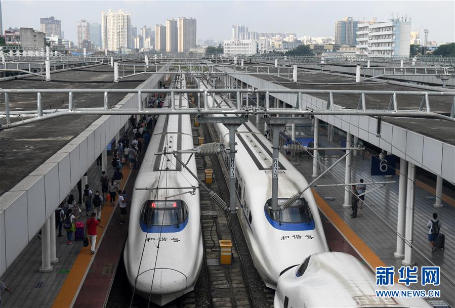 在廣西南寧東站,旅客在排隊候車,準(zhǔn)備出行(9月4日攝)。 廣西壯族自治區(qū)成立60年來,鐵路建設(shè)發(fā)生翻天覆地的變化。來自中國鐵路南寧局集團(tuán)有限公司的數(shù)據(jù)顯示,1958年廣西鐵路總里程為1346.3公里,如今廣西鐵路總里程達(dá)5191公里。廣西與周邊相鄰省份間實現(xiàn)動車“公交化”開行。此外,北部灣港—重慶班列、東盟海產(chǎn)品冷鏈班列、“百色一號”果蔬專列等的開通和運營,強化了鐵路供給的針對性和有效性。鐵路成為助推廣西經(jīng)濟(jì)社會快速發(fā)展的“大動脈”。 新華社記者陸波岸攝