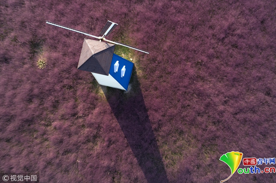 游客在生態(tài)樂園粉黛亂子草中的風(fēng)車。