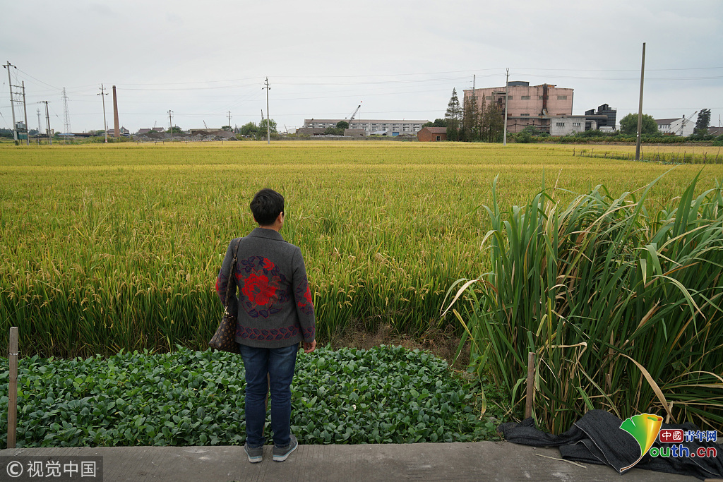 2018年10月14日,浙江嘉興嘉善縣陶莊,張娟芬(何永妹)家的草房子早沒(méi)有了,原址現(xiàn)在是一個(gè)小工廠,周?chē)寝r(nóng)田。垂下的稻穗飽滿發(fā)黃,等待收割。圖片作者:田建明