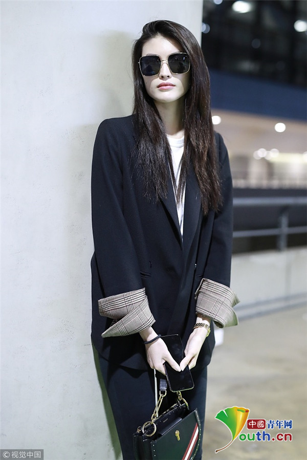2018年10月15日,上海,何穗亮相機(jī)場(chǎng)。她身穿深色西裝搭配黑色緊身褲大秀超模身材,簡(jiǎn)約造型依舊高級(jí)感十足,輕撩秀發(fā)散發(fā)女人味。