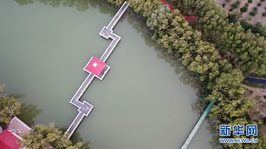 俯瞰恩格貝月亮湖。(新華網 王宇 攝)
