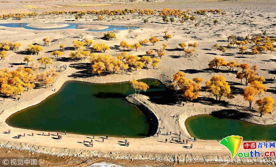 中國青年網(wǎng)北京10月9日電 2018年10月7日至8日,內(nèi)蒙古自治區(qū)阿拉善盟額濟納旗,地處巴丹吉林沙漠。額濟納河兩岸壯觀的胡楊林堪稱大漠的一顆綠色明珠,每年深秋時節(jié)的第一場秋霜過后,大片的胡楊樹葉由綠變黃,一眼望去,陽光下金色的樹葉襯著湛藍的天空于風中婆娑起舞,鮮明的影調(diào),亮麗的色彩,令人流連忘返。