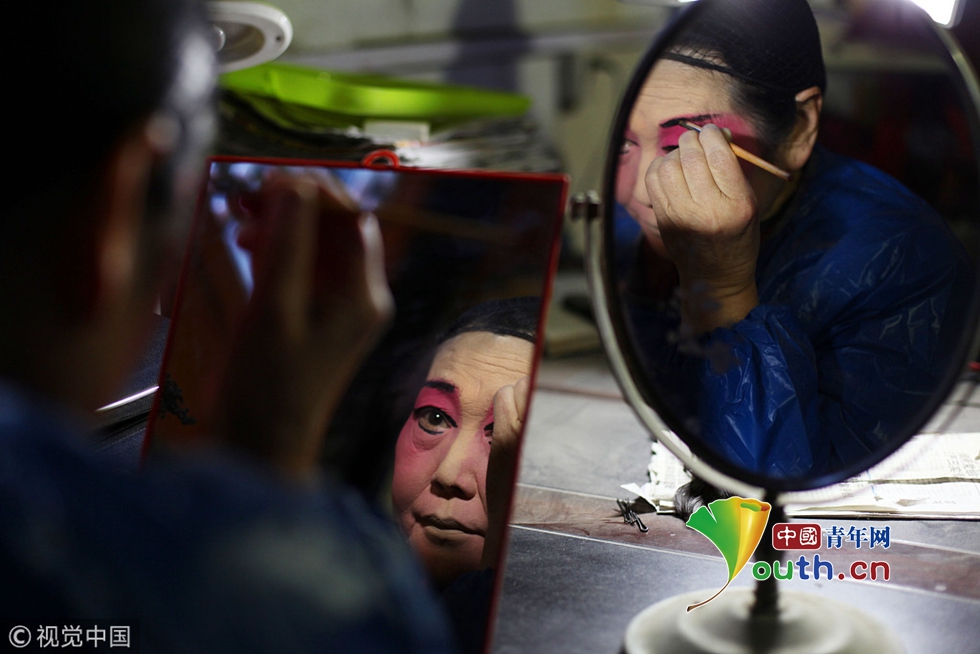2016年3月10日,陜西安康,今年70歲的劉鳳鳴10歲時(shí)開始學(xué)漢調(diào)二黃,40歲時(shí)從廁所抱回智殘?bào)w殘棄嬰,因?yàn)閷λ囆g(shù)的熱愛、對生命的敬畏她選擇了不離不棄。人生如戲,戲如人生。劉鳳鳴說,像她們這樣的業(yè)余劇團(tuán),沒有專門的化妝師,她要求每個(gè)演員必須學(xué)會化妝。圖片作者:魏永賢/視覺中國