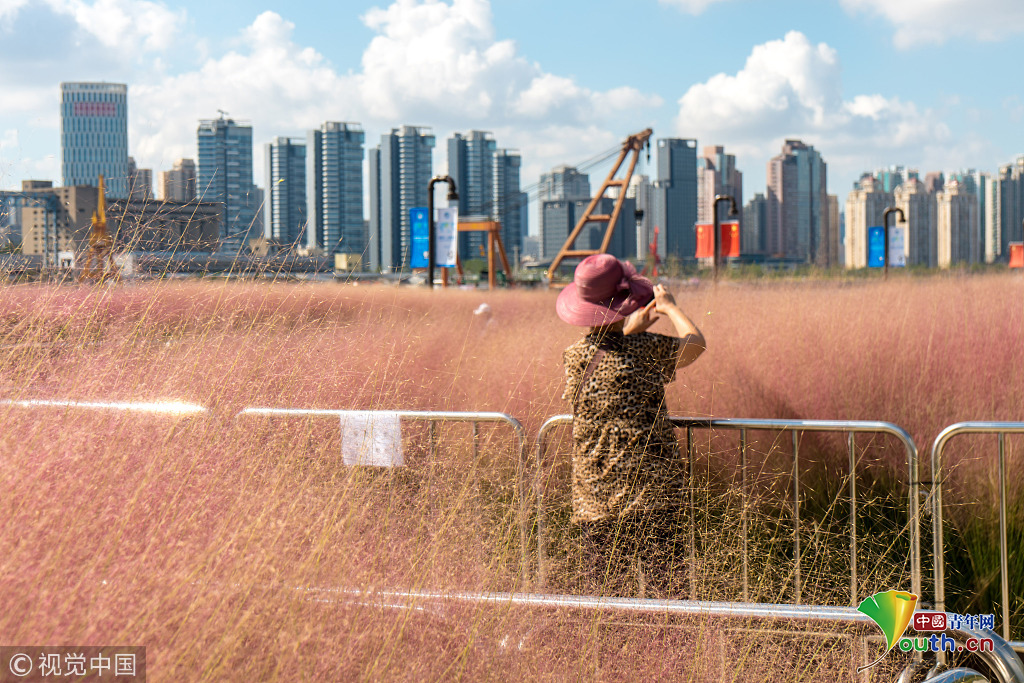 2018年9月28日,上海,東外灘楊浦濱江的粉黛亂子草目前已進(jìn)入盛花期,當(dāng)日早間,不少市民來到濱江拍照賞景,成片的紫色花海在藍(lán)天白云映襯下美不勝收。圖片作者:王岡/視覺中國