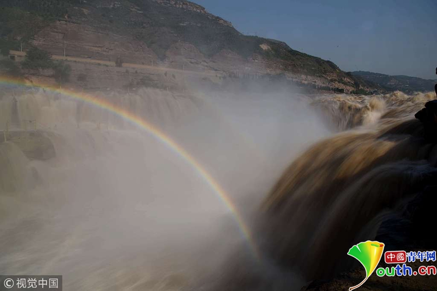 5月31日,山西臨汾奔騰咆哮的黃河壺口瀑布吸引游客。近日,受上游地區(qū)降雨量增多影響,黃河干流晉陜峽谷水量大增,每秒流量達到1100立方,是常年同期的三倍,壺口瀑布出現(xiàn)五月份罕見的瀑布群景觀,吸引了眾多游客。