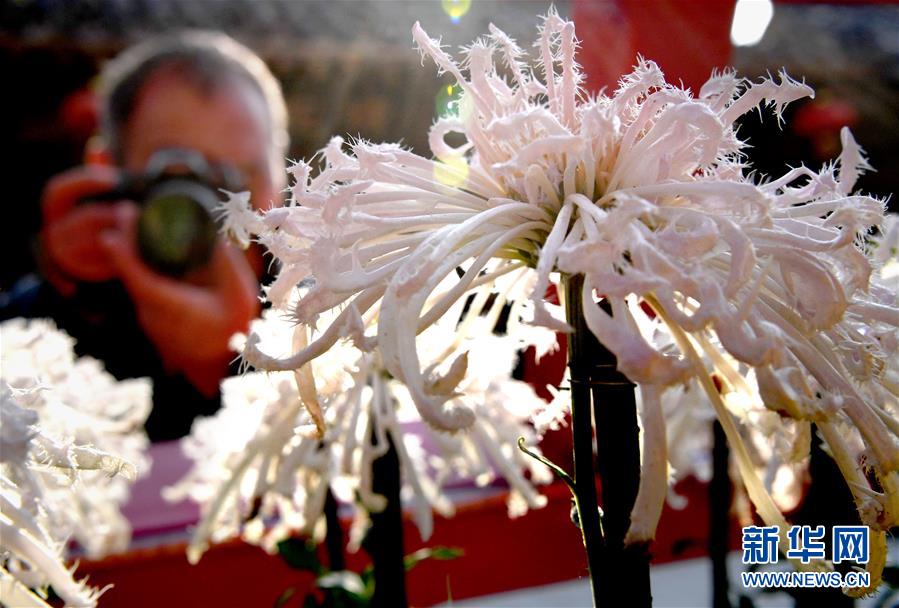 10月17日,游客在開封清明上河園內(nèi)拍攝展出的菊花。重陽時(shí)節(jié),各色菊花競相綻放,把古都開封裝點(diǎn)得分外秀美,吸引眾多游客前來觀賞游玩。 新華社記者 李安 攝