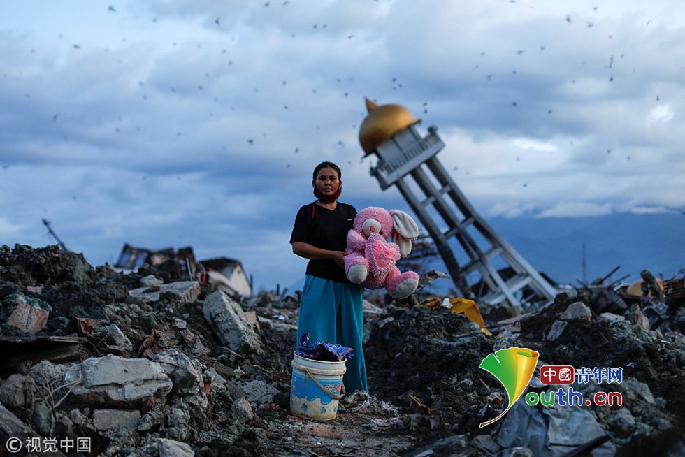 當(dāng)?shù)貢r(shí)間2018年10月7日,印尼帕盧,一名婦女在廢墟中找到了一個(gè)毛絨兔子玩具,她在地震中失去了三個(gè)孩子。圖片作者:JORGE SILVA/視覺(jué)中國(guó)