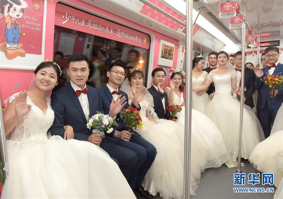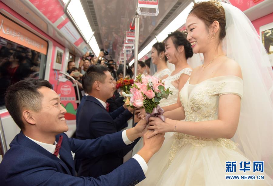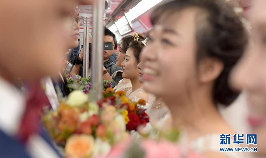 10月18日,在合肥市地鐵一號線,新人們準(zhǔn)備乘坐地鐵。當(dāng)日,中鐵四局集團城市軌道交通工程分公司的18對新人在安徽合肥地鐵一號線的車廂里舉行了一場集體婚禮儀式。 新華社記者 郭晨 攝