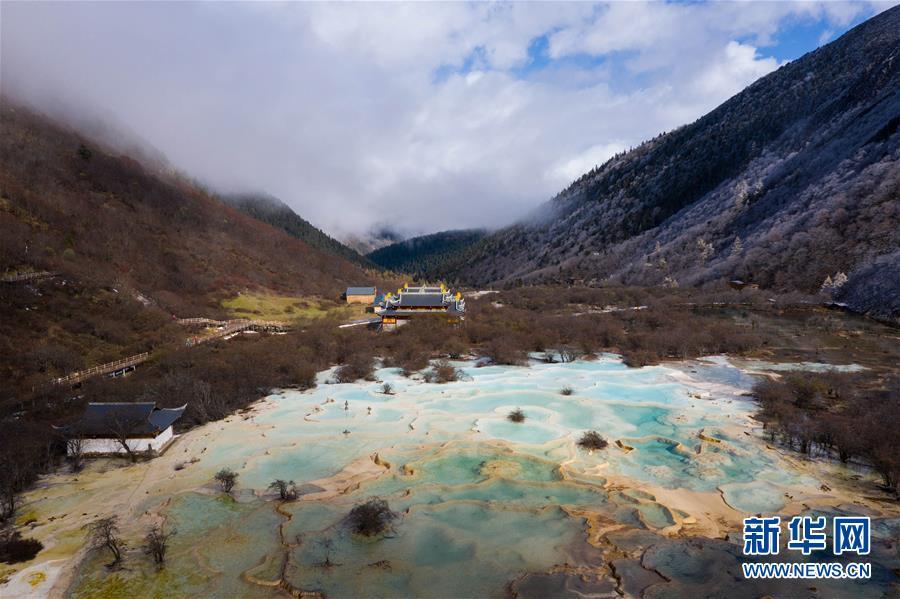 俯瞰黃龍溝五彩池和黃龍寺(10月19日無人機拍攝)。深秋時節(jié),在雪山、藍天、白云和彩林映襯下,黃龍溝中的彩池色彩更加斑斕,目前黃龍景區(qū)進入觀賞最佳時節(jié)。黃龍風(fēng)景名勝區(qū)位于四川省松潘縣境內(nèi),以彩池、灘流、雪山、峽谷、森林等聞名,享有“人間瑤池”“圣地仙境”之美譽。新華社記者 江宏景攝