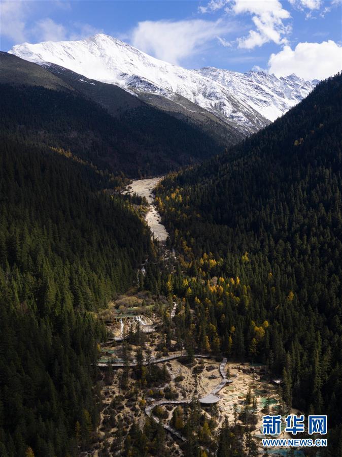 黃龍溝在藍天白云、雪山和彩林的映襯下風(fēng)景如畫(10月19日無人機攝)。深秋時節(jié),在雪山、藍天、白云和彩林映襯下,黃龍溝中的彩池色彩更加斑斕,目前黃龍景區(qū)進入觀賞最佳時節(jié)。黃龍風(fēng)景名勝區(qū)位于四川省松潘縣境內(nèi),以彩池、灘流、雪山、峽谷、森林等聞名,享有“人間瑤池”“圣地仙境”之美譽。新華社記者 江宏景攝
