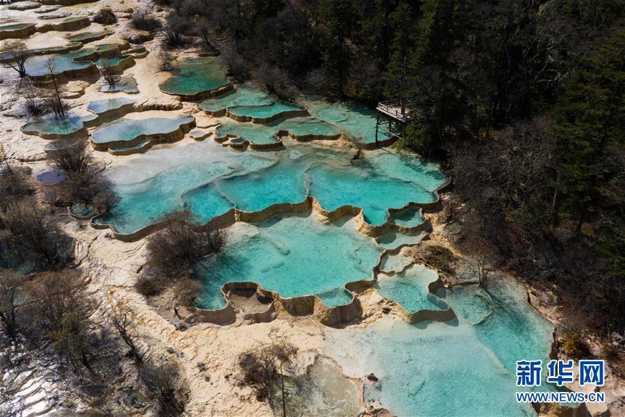 俯瞰黃龍溝五彩池一角,彩池錯落有致,宛如層層玉盤(10月19日無人機拍攝)。 深秋時節(jié),在雪山、藍天、白云和彩林映襯下,黃龍溝中的彩池色彩更加斑斕,目前黃龍景區(qū)進入觀賞最佳時節(jié)。黃龍風(fēng)景名勝區(qū)位于四川省松潘縣境內(nèi),以彩池、灘流、雪山、峽谷、森林等聞名,享有“人間瑤池”“圣地仙境”之美譽。新華社記者 江宏景攝