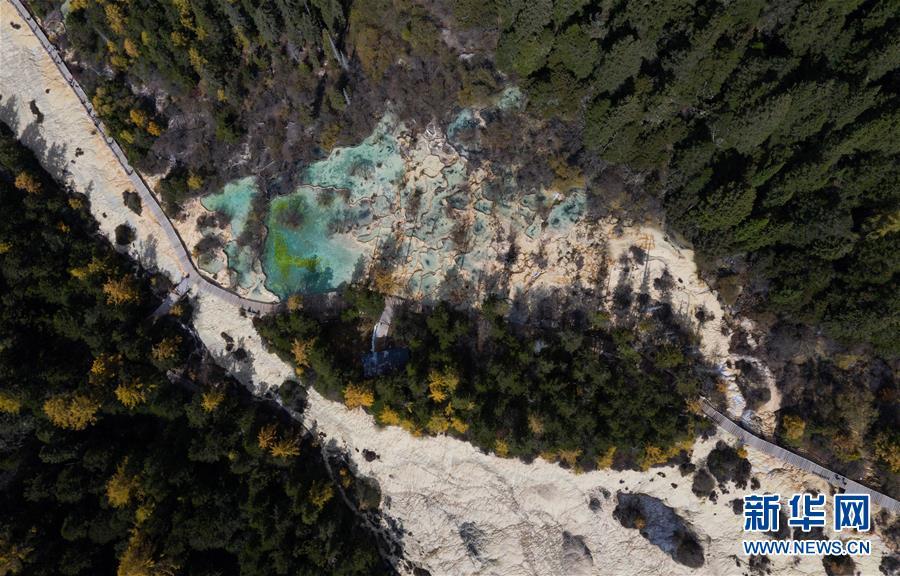 俯瞰黃龍溝盆景池(10月19日無人機(jī)拍攝)。深秋時(shí)節(jié),在雪山、藍(lán)天、白云和彩林映襯下,黃龍溝中的彩池色彩更加斑斕,目前黃龍景區(qū)進(jìn)入觀賞最佳時(shí)節(jié)。黃龍風(fēng)景名勝區(qū)位于四川省松潘縣境內(nèi),以彩池、灘流、雪山、峽谷、森林等聞名,享有“人間瑤池”“圣地仙境”之美譽(yù)。新華社記者 江宏景攝