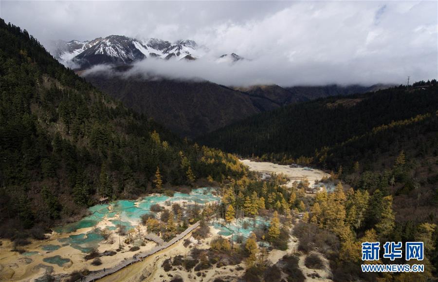 雪山、彩林、彩池構(gòu)成一幅色彩斑斕的畫(huà)卷(10月19日無(wú)人機(jī)拍攝)。深秋時(shí)節(jié),在雪山、藍(lán)天、白云和彩林映襯下,黃龍溝中的彩池色彩更加斑斕,目前黃龍景區(qū)進(jìn)入觀賞最佳時(shí)節(jié)。黃龍風(fēng)景名勝區(qū)位于四川省松潘縣境內(nèi),以彩池、灘流、雪山、峽谷、森林等聞名,享有“人間瑤池”“圣地仙境”之美譽(yù)。新華社記者 江宏景攝