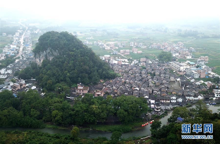 廣西富川瑤族自治縣朝東鎮(zhèn)秀水村連片民居(10月19日無(wú)人機(jī)拍攝)?!⌒氯A社記者 周華 攝