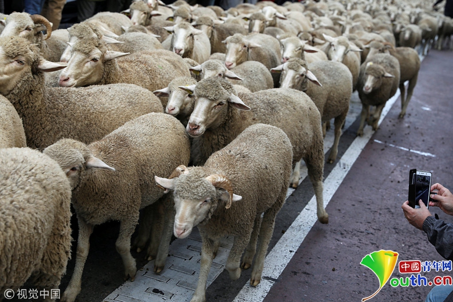 西班牙牧羊人驅(qū)趕羊群穿越馬德里 羊群進(jìn)城“參觀”