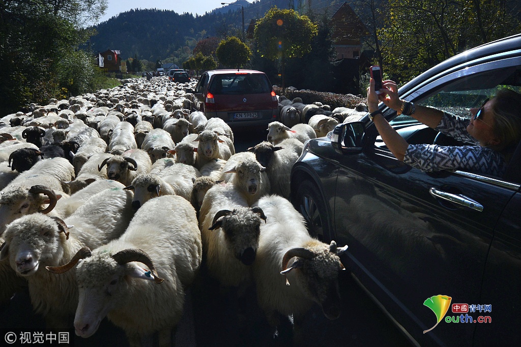 西班牙牧羊人驅(qū)趕羊群穿越馬德里 羊群進(jìn)城“參觀”