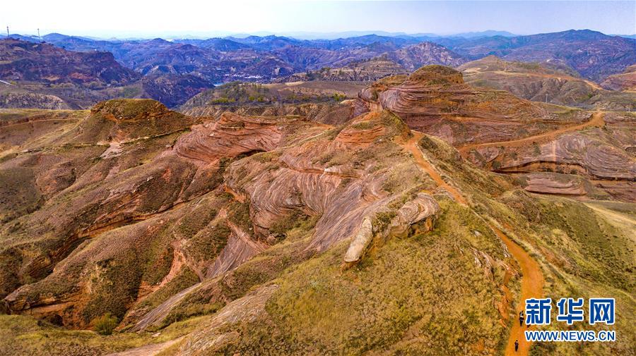 在黃土高原的陜西省延安市安塞區(qū)坪橋鎮(zhèn)王家灣,有一處峽谷丹霞地貌,是2017年陜西省地質(zhì)調(diào)查院在陜北及渭北地區(qū)發(fā)現(xiàn)大規(guī)模丹霞地貌的一部分。這里的山勢頂部被黃土覆蓋,底部經(jīng)流水下切侵蝕紅色砂巖外露,出露的巖石紋理如波浪,深秋中猶如一幅流動的畫卷。