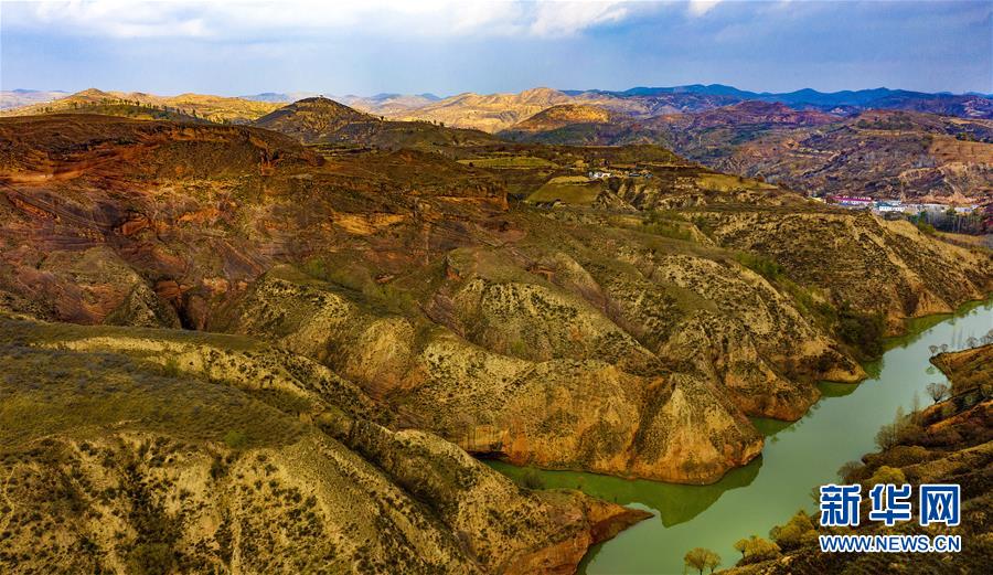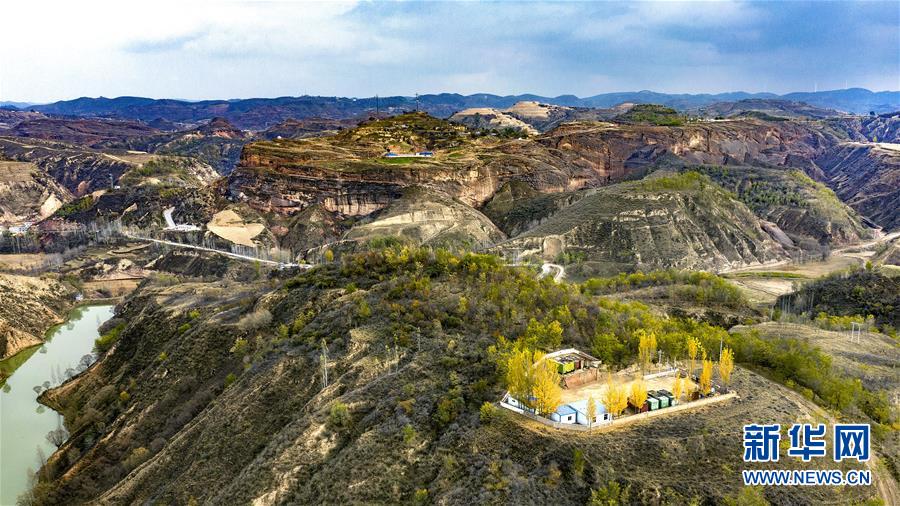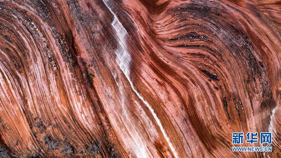 在黃土高原的陜西省延安市安塞區(qū)坪橋鎮(zhèn)王家灣,有一處峽谷丹霞地貌,是2017年陜西省地質(zhì)調(diào)查院在陜北及渭北地區(qū)發(fā)現(xiàn)大規(guī)模丹霞地貌的一部分。這里的山勢頂部被黃土覆蓋,底部經(jīng)流水下切侵蝕紅色砂巖外露,出露的巖石紋理如波浪,深秋中猶如一幅流動的畫卷。