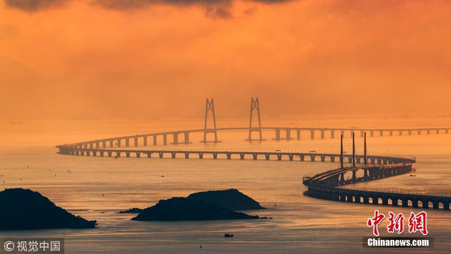 2018年1月15日,廣東珠海,記者再上港珠澳大橋。夕陽西下,港珠澳大橋在晚霞的映照下顯得格外壯麗秀美。于燕敏 攝 圖片來源:視覺中國
