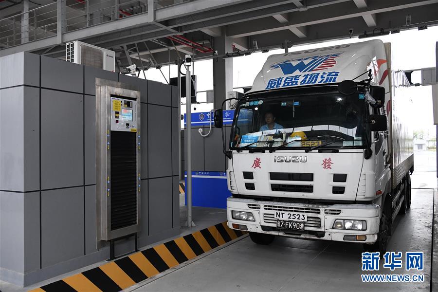 這是貨運(yùn)車(chē)輛在進(jìn)行模擬通關(guān)(10月17日攝)。 新華社記者 梁旭 攝