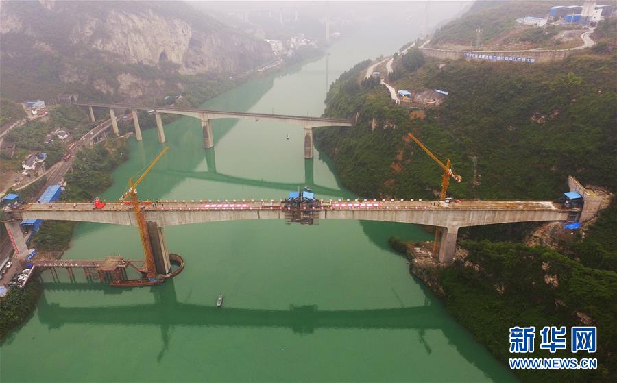 在重慶涪陵拍攝的渝懷鐵路涪秀二線重點(diǎn)工程——烏江右線大橋(10月23日無人機(jī)拍攝)。 10月23日,由中鐵四局承建的渝懷鐵路涪秀二線重點(diǎn)工程——烏江右線大橋主跨成功合龍,標(biāo)志著大橋主體工程全部順利結(jié)束。烏江右線大橋項(xiàng)目全程460.1米,主跨192米,跨越烏江和319國道。在兩年多的建設(shè)過程中,施工人員攻克了“不等高墩”“不對稱邊跨”“邊跨入隧”等多個技術(shù)難題。 新華社記者王全超攝