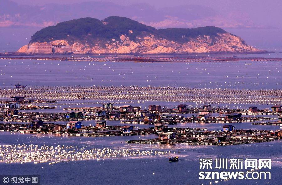 2018年10月26日,在福建連江海域上,“海上田園”網(wǎng)箱羅列,漁排上搭建的木屋錯(cuò)落成“戶”,蔚為壯觀,成為一道獨(dú)特的風(fēng)景線。福建省連江縣是中國(guó)鮑魚(yú)養(yǎng)殖第一大縣。