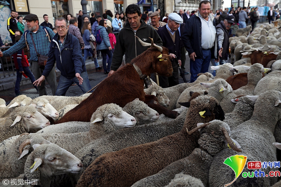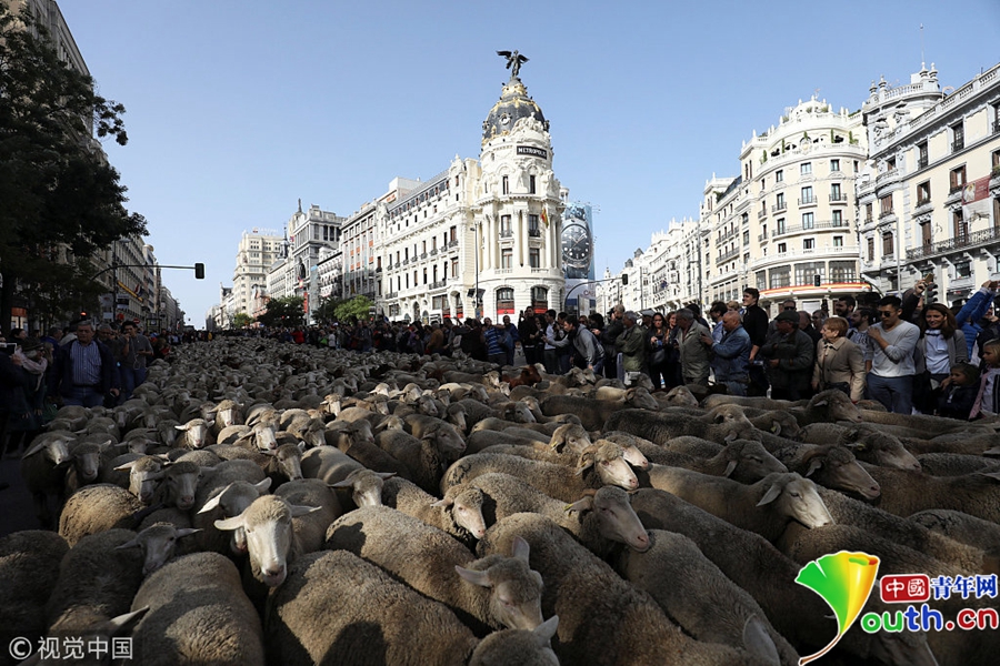 牧羊人驅(qū)趕成百上千只綿羊穿越馬德里市街。