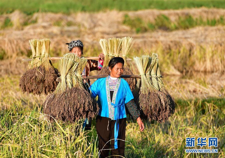 10月30日,在廣西融水苗族自治縣安太鄉(xiāng)元寶村,村民挑著香糯走在田間。 新華社記者 黃孝邦 攝