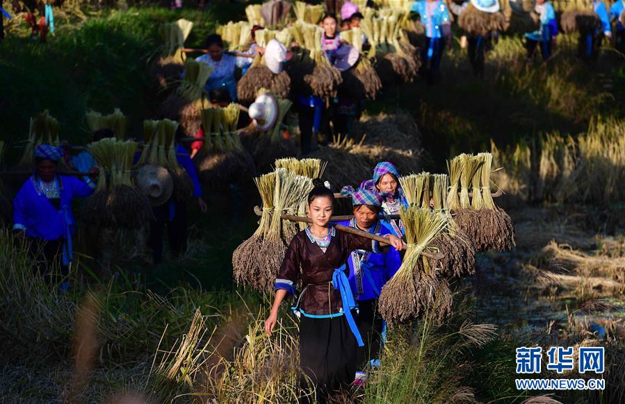 10月30日,在廣西融水苗族自治縣安太鄉(xiāng)元寶村,村民挑著香糯走在田間。 新華社記者 黃孝邦 攝