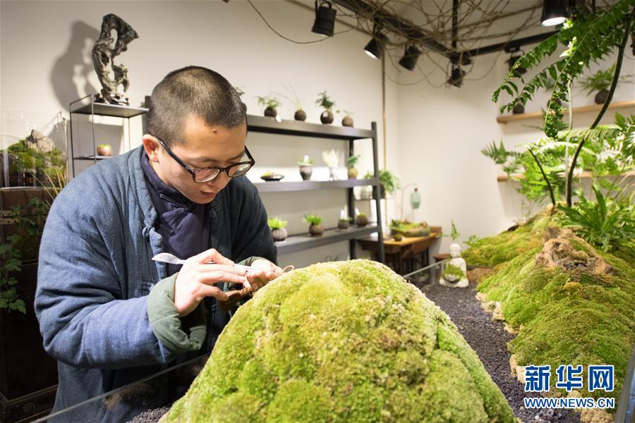 安徽籍藝術(shù)家潘銳在2012年創(chuàng)立于杭州市外桐塢村的“植覺”工作室打點(diǎn)苔蘚盆景(2018年1月14日攝)。外桐塢村是西湖西面群山中的一個(gè)小村落,傳統(tǒng)以茶葉生產(chǎn)為主要經(jīng)濟(jì)來源。自2010年以來,外桐塢村著力打造藝術(shù)村落。 新華社記者 翁忻旸 攝