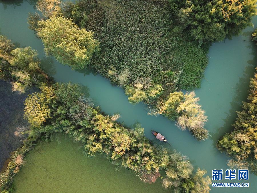 10月29日,游船行駛在西溪濕地河道上(無人機拍攝)。 新華社記者翁忻旸攝