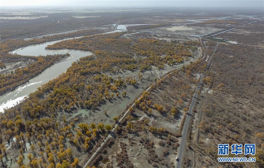 從空中俯瞰新疆尉犁縣喀爾曲尕鄉(xiāng),兩條道路沿著塔里木河岸邊的金色胡楊向前延伸(10月25日無人機(jī)拍攝)。 10月中下旬,靜靜的塔里木河中下游一片金黃。胡楊深處,條條小路蜿蜒綿長通向遠(yuǎn)方,引人入勝。 塔里木河是中國最長的內(nèi)陸河,這一區(qū)域原始胡楊林分布較為集中。隨著塔里木河連續(xù)19次向下游生態(tài)輸水,為胡楊林“解渴”,塔河兩岸生態(tài)得到明顯改善,沙地面積逐年減少。 新華社記者趙戈攝
