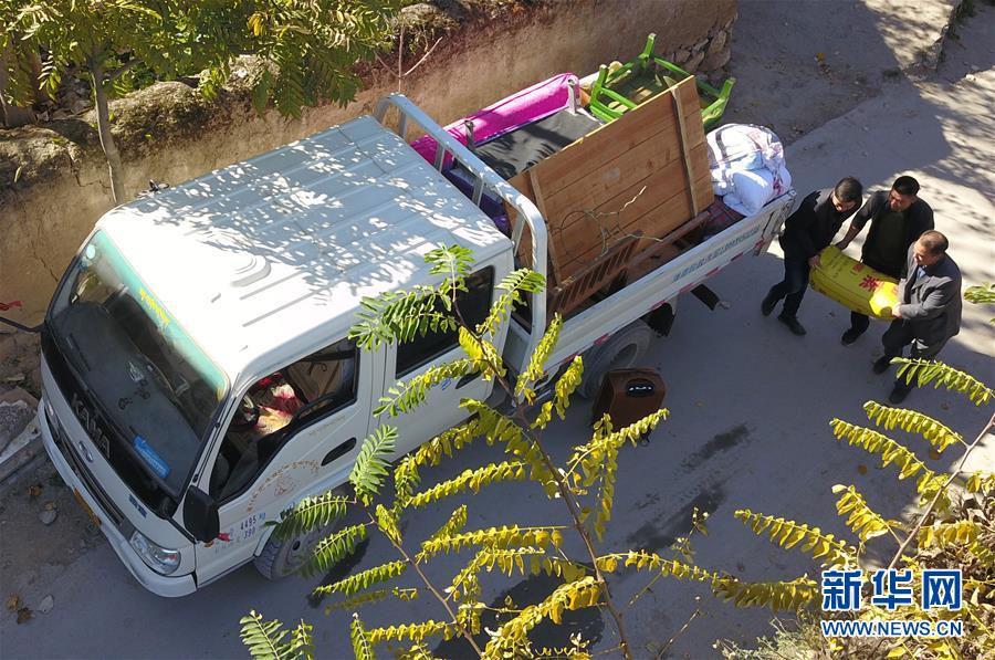 在隴南市武都區(qū)坪埡藏族鄉(xiāng)舊墩村,村民將物品裝車準備搬遷下山(10月31日無人機拍攝)。 新華社記者 范培珅攝