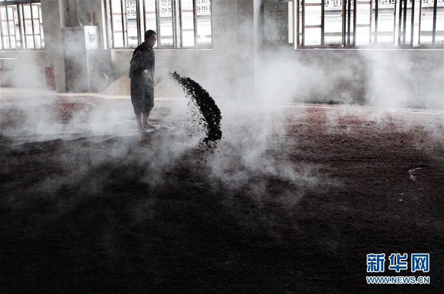 貴州省仁懷市茅臺鎮(zhèn)茅臺酒廠的釀酒工人把蒸好的糯高粱進(jìn)行攤涼(10月23日攝)。 新華社記者 林立平 攝