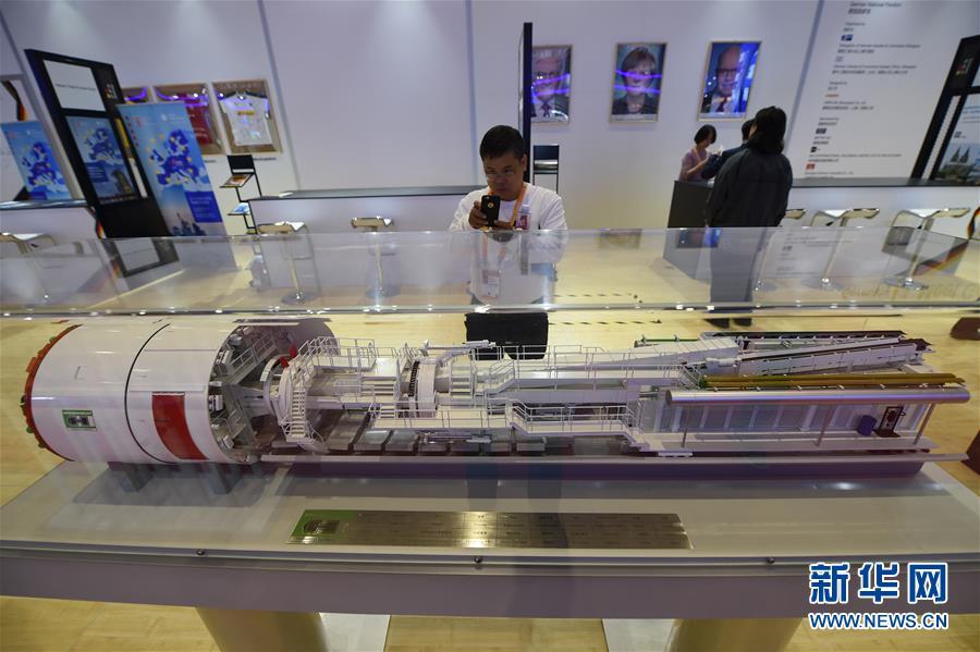11月5日,一名參觀者在德國展館內(nèi)拍攝雙護(hù)盾盾構(gòu)機(jī)模型。 新華社記者 韓瑜慶 攝