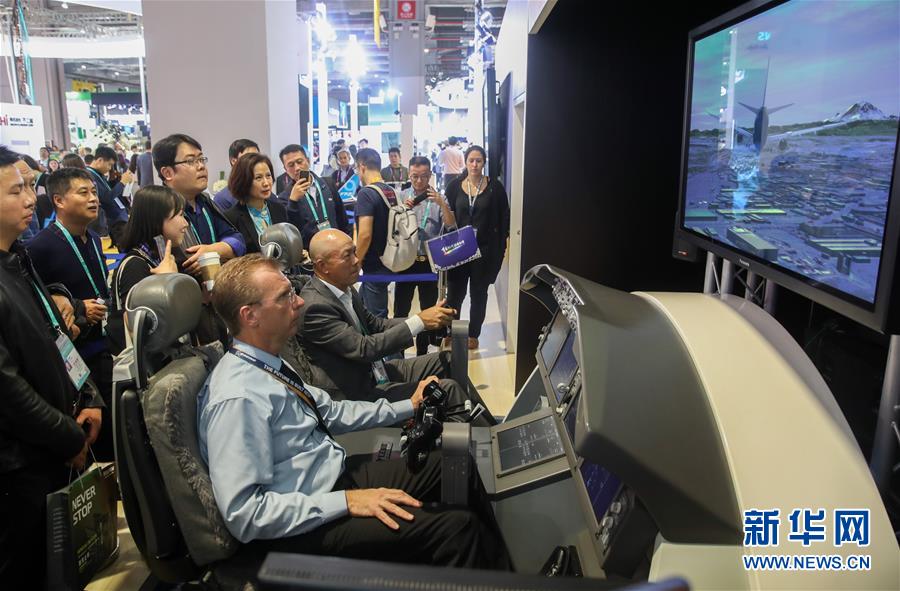 11月6日,參觀者在美國(guó)波音公司展臺(tái)體驗(yàn)“駕駛”波音客機(jī)。新華社記者 丁汀 攝