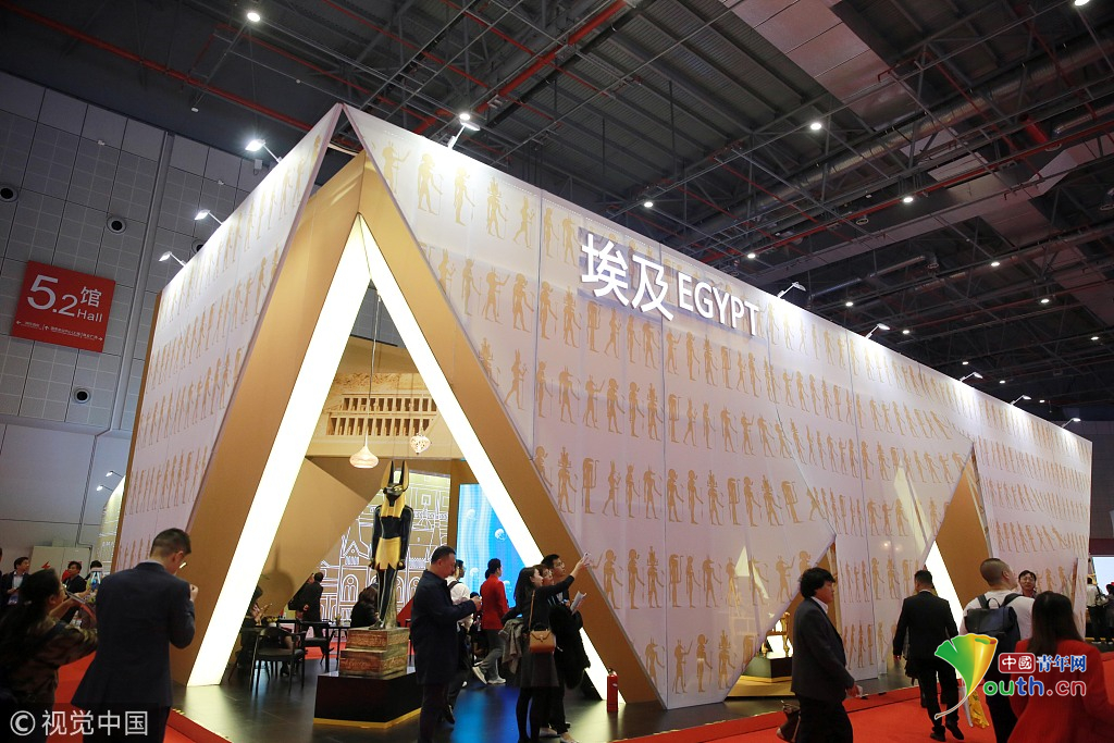 2018年11月6日,上海,首屆中國國際進(jìn)口博覽會國家展上,共有82個國家、3個國際組織設(shè)立了71個展臺。埃及館。視覺中國