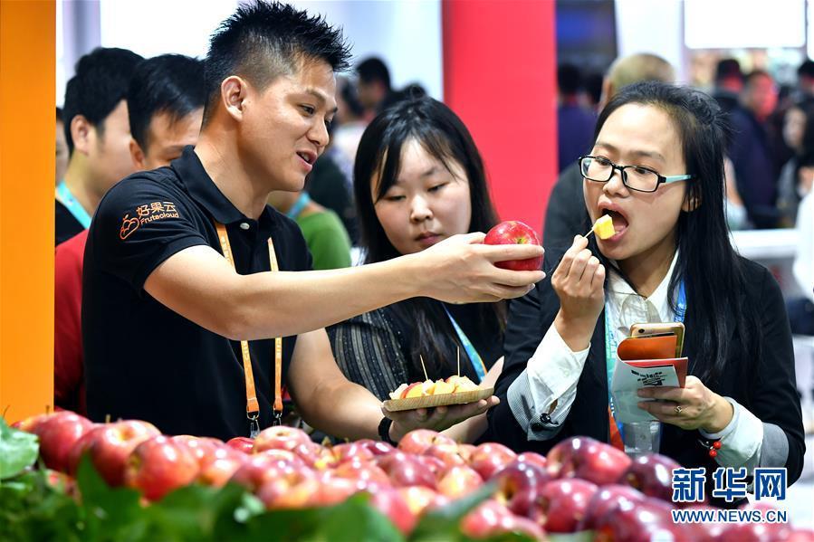 11月7日,好果云公司的工作人員(左)為參觀者介紹從美國進(jìn)口的一款蘋果。