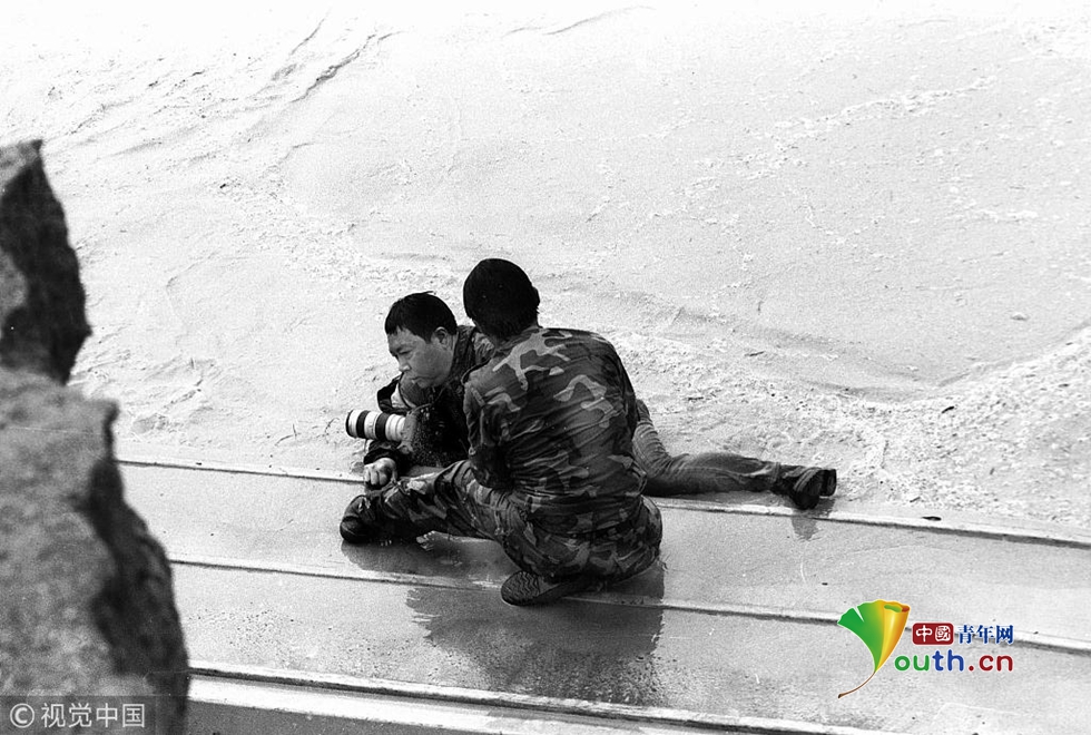 2000年10月10日,華商報(bào)記者鄧長(zhǎng)泰在渭河決口處采訪時(shí)落入激流。 華商報(bào)記者 鄧長(zhǎng)泰 圖片作者:胡國(guó)慶/視覺(jué)中國(guó)