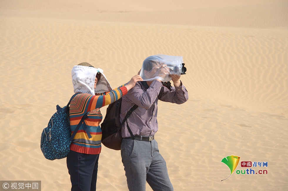 2013年05月05日,河北省張家口市,懷來天漠景區(qū)里的一名全副武裝的攝影師在風中拍攝?!D片作者:蘇衛(wèi)忠/視覺中國
